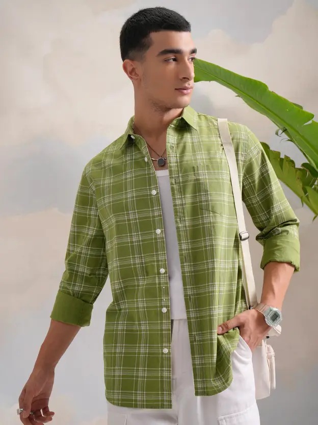 Men Slim Fit Checkered Cut Away Collar Formal Shirt