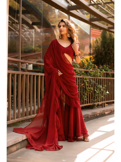 Carmine Maroon Georgette Embroidered Pre Stitch Saree Sharara with Unstitched Blouse