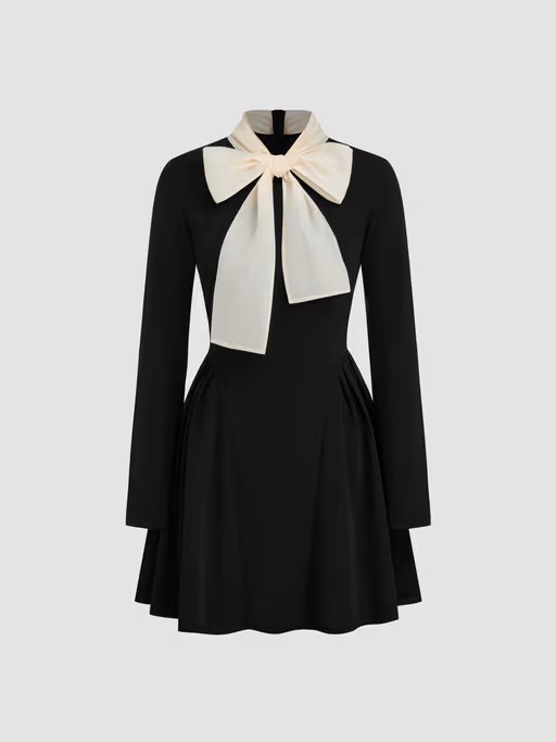 High Neck Solid Knotted Ruffle Hem Long Sleeve Mini Dress