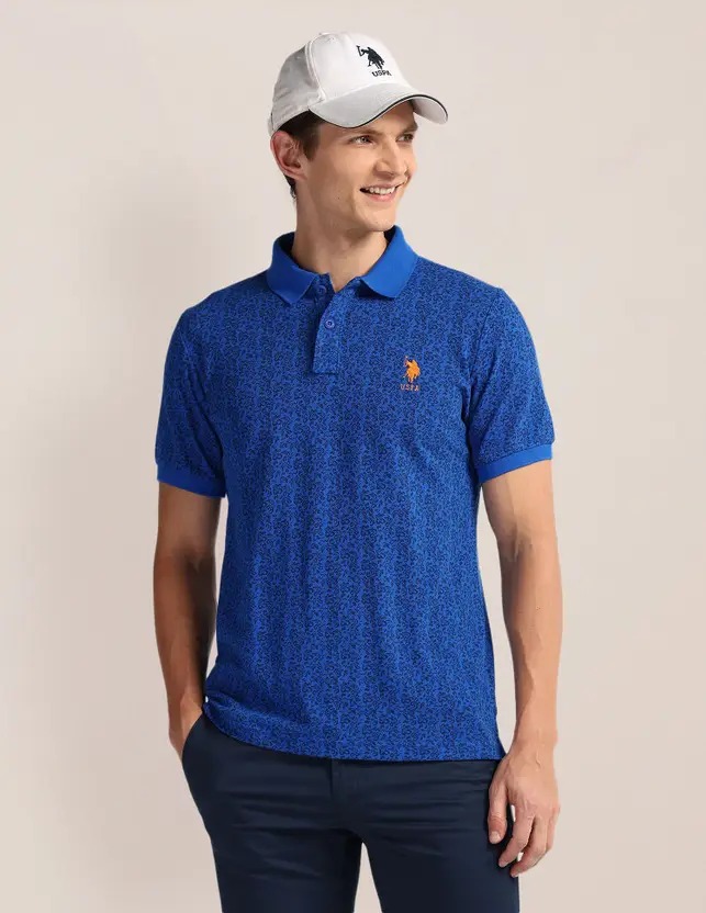 Men Printed Polo Neck Pure Cotton Blue T-Shirt