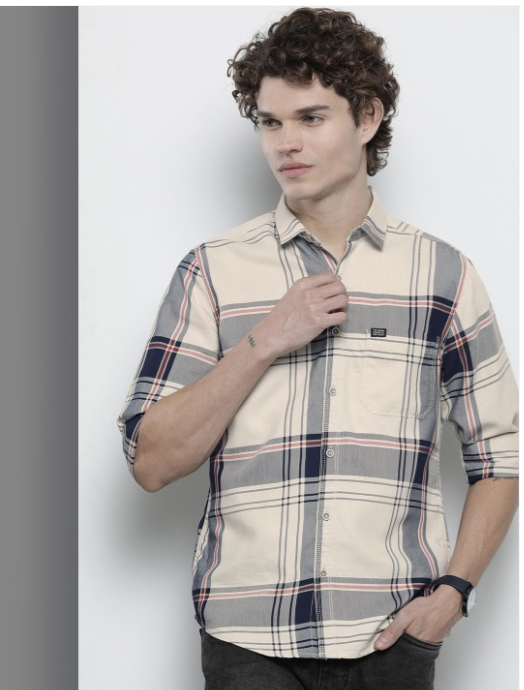 Cream-coloured and navy blue tartan checked Casual shirt ,has a spread collar, button placket, 1 patch pocket, long regular sleeves, curved hem