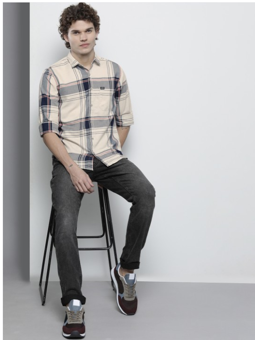 Men Cream-Coloured & Navy Blue Tartan Checked Shirt