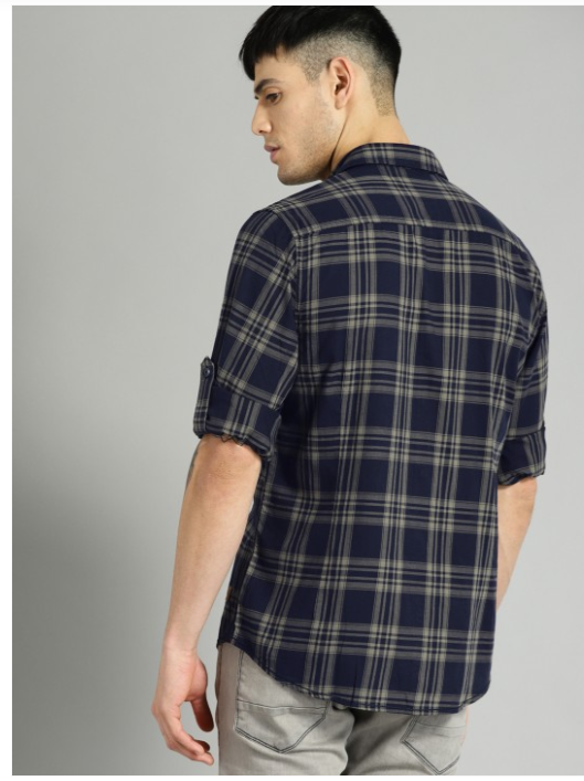Blue and grey checked casual shirt, has a spread collar, long sleeves with roll-up tabs, curved hem, one patch pocket