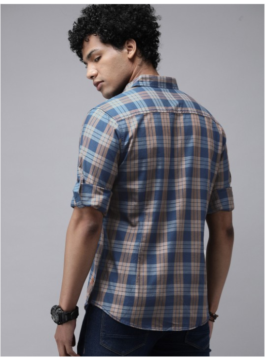 Blue and grey tartan checked Casual shirt, has a cutaway collar, button placket, 1 patch pocket, long roll-up sleeves, curved hem