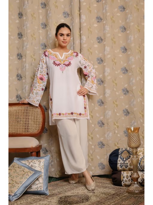The 32-inch short kurta features exquisite Kashmiri Aari work, blending traditional craftsmanship with modern design. Its Notch neck style adds a touch of sophistication, suitable for both casual and formal wear. Crafted with precision, the Black kurta exudes purity and sophistication, complemented by the celestial inspiration of "Falak." This intricate embroidery and decorative patterns are reminiscent of Kashmir's rich cultural heritage, showcasing the region's skilled artisans. Pair with vibrant palazzos for a chic contrast or leggings for a classic look. Elevate any occasion with this timeless piece, effortlessly combining tradition and modernity.