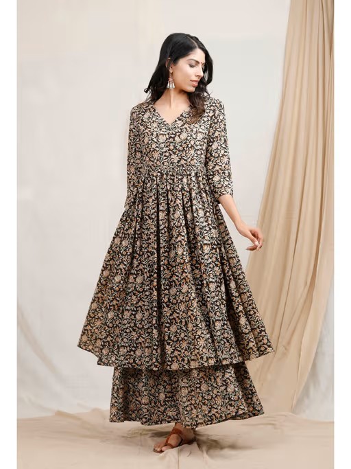 This black kurta is crafted in cotton and features a V- neck, 3/4th sleeves and printed detailing all over. Buy this kurta online and team it with flared pants and heels to create a trendy look.