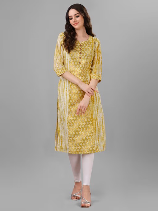 This is a One piece Kurta Color- Yellow & WhiteFabric- Pure Cotton CambricPattern- Shibori PrintNeck Type- Round Neck with VDesign Details- Shoulder princess line finished with piping. Fabric Border at the sleeve hem with piping. Wooden buttons at front. Wash Care Details- Hand washModel Details- Model is wearing S sizeDisclaimer- Slight colour variations may occur due to Screen Settings