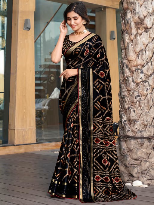 Black Cotton Ikat Zari Border Printed Saree Saree with Unstitched Blouse