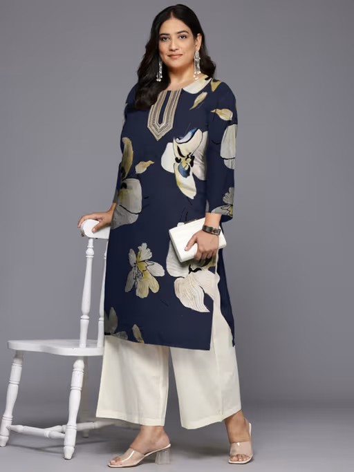 Update your look with this captivating floral printed sequinned floral georgette kurta from A plus by Ahalyaa. Made from high-quality georgette, this piece features full sleeves and a round neck. Style it with minimal jewellery and sandals to complete the ensemble.