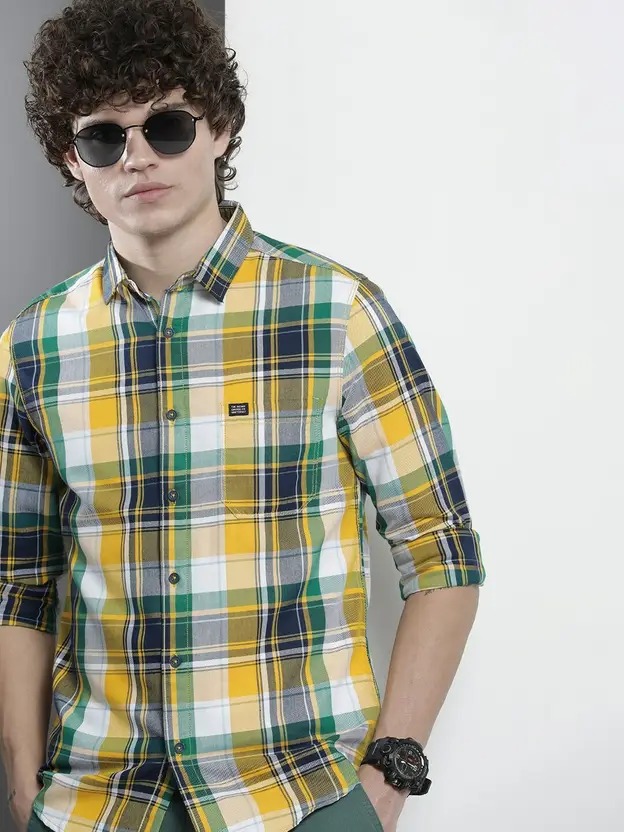 Men Regular Fit Checkered Cut Away Collar Casual Shirt