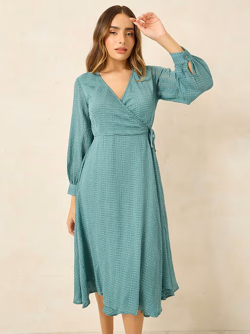 Green Full Sleeves Wrap Self Design Midi Dress
