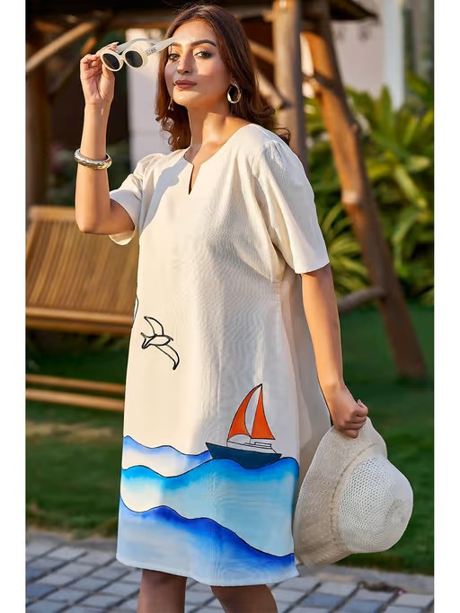 Stay stylish with this off white dress from Curvy Lane. Made from high quality cotton, it features pull on closure and printed pattern along with half sleeves & round neck design. Pair it with sneakers with minimal jewellery to complete your ensemble