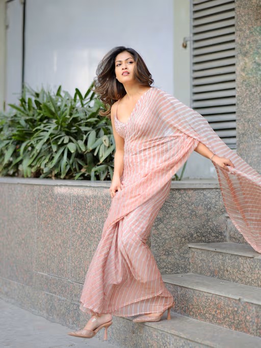 Elegant and vibrant, this PInk hand-dyed leheriya chiffon saree exudes grace and charm. Paired with a matching solid Taupe silk blouse, it offers a perfect blend of tradition and contemporary style. A stunning choice for any special occasion.