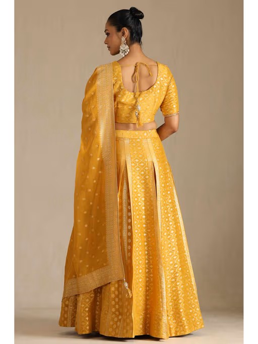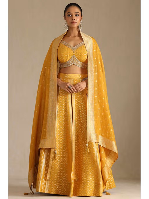 Get festive-ready with this mustard lehenga choli from Soch. Crafted from viscose, this beautiful set is finished with half sleeves and a v-neck. Complete the look with a pair of heels and statement jewellery.