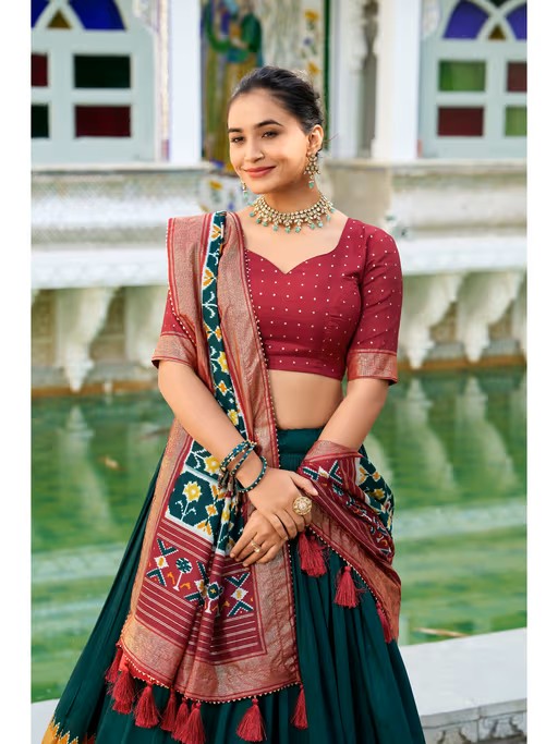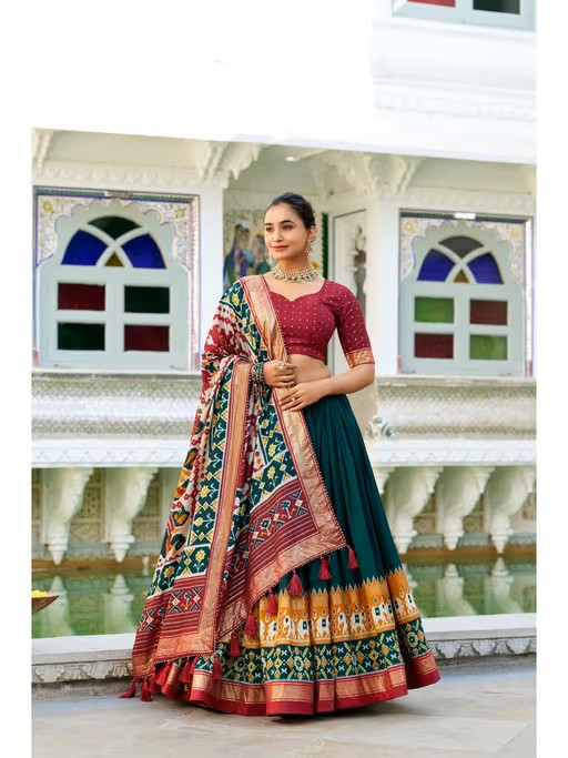 Lehenga(Stitched) Lehenga Fabric : Tussar Silk Lehenga Work : Patola Print With Foil Work Waist : Supported Up To 42 Stitching : Stitched With Canvas And Attached With Can Length : 42 Flair : 3.80 Meter Inner : Micro Cotton Blouse(Unstitched) Blouse Fabric : Tussar Silk Blouse Work : Foil Printed Blouse Length : 0.80 Meter Dupatta Fabric : Tussar Silk Dupatta Work : Patola Print With Gotta Patti Lace Border Also Comes With Tassels Dupatta Length : 2.5 Meter
