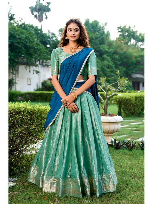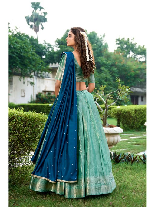 Green Woven Stitched Lehenga with Unstitched Blouse and Dupatta (Set of 3)