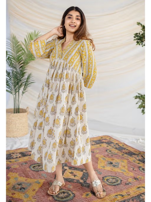 Capture subtle beauty in this Anaisha Bagru Cotton Dress, featuring an intricate bagru print that's perfect for summer days. Crafted from premium cotton, this dress features 3/4th sleeves, a V-neck, and a flared silhouette for a flattering look. Ideal for dressy occasions, this dress offers a timeless sophistication to any wardrobe.