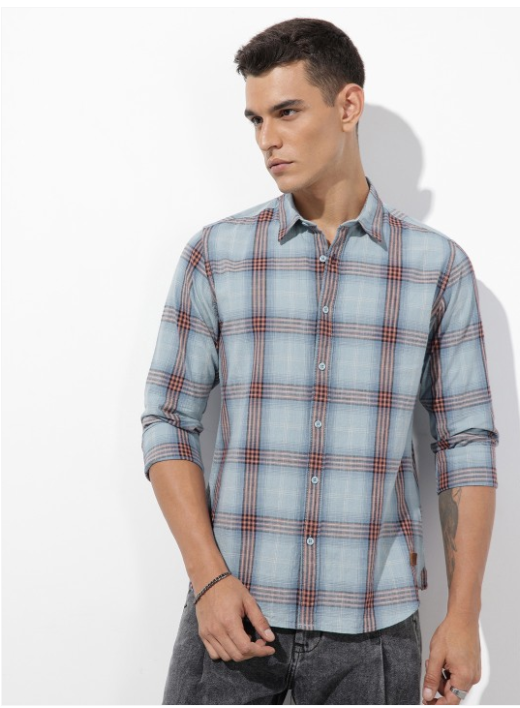 Blue & rust coloured checked opaque casual shirt, has a spread collar, button placket, long regular sleeves, curved hem
