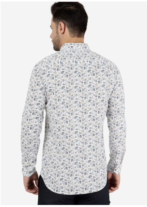 White floral printed opaque casual shirt, has a spread collar, button placket, 1 patch pocket, long regular sleeves, curved hem