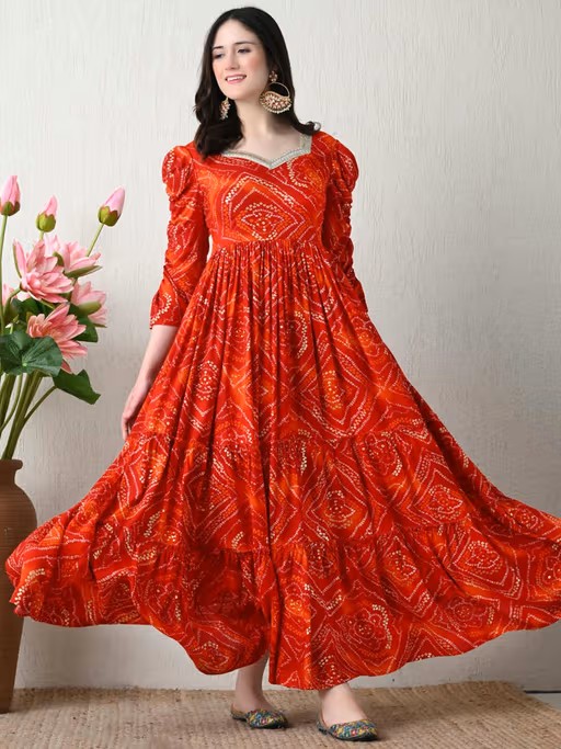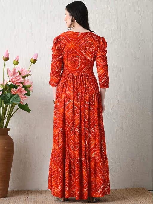 Red Rayon Bandhej Printed Tiered Dress. Dress Has Sweetheart Neck with Attached Beautiful Gota Lace and Regular Sleeves with Attached Elastic band . Dress Length- 56'' Inch.