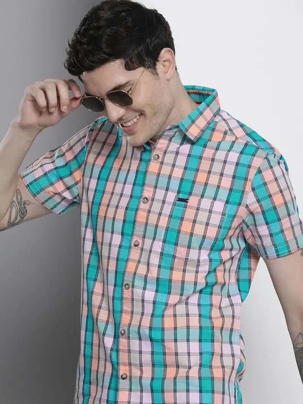 Men Slim Fit Checkered Cut Away Collar Casual Shirt