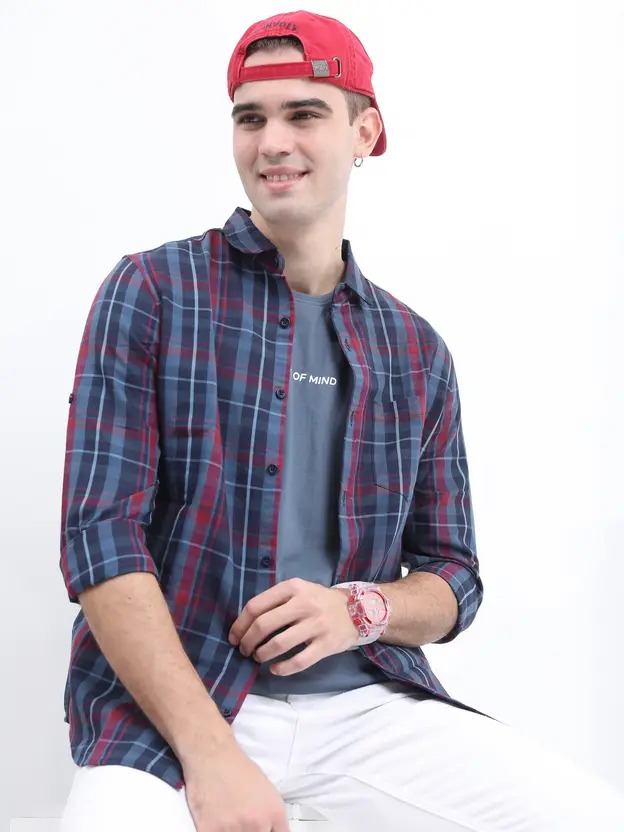 Men Slim Fit Checkered Cut Away Collar Casual Shirt