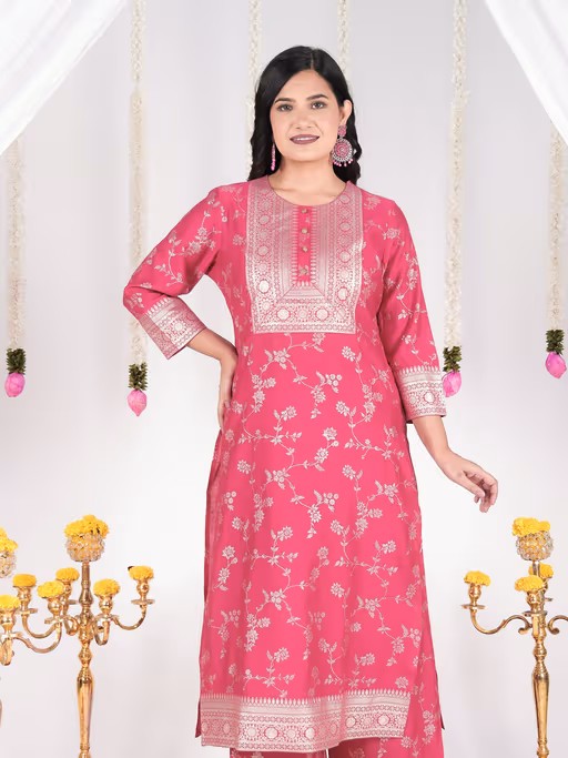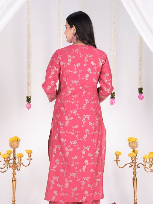 Take your style game up a notch with this pink kurta from ARAMYA. Crafted from silk blend, this beautiful kurta features three fourth sleeves and a round neck. Team it with a pair of trousers, heels, and stud earrings.