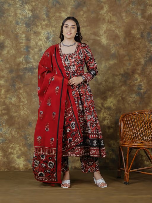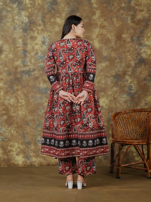 Kurta Fabric: Soft Cotton |Kurta Color: Red |Print: Paisley |Occasion: Light Occasion |Wash Care: Machine Wash |Kurta Shape: Anarkali |Neck Type: Square |Kurta Length: Calf Length |Sleeve Length: Full Sleeve