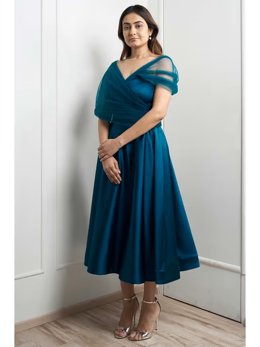 A Modest Silhouette With Tulle Detail On The Neckline. The Midi Is A Full Skirt , Full Flare Design With Substantial Size Pockets On The Sides For A Beautiful And Comfortable Look