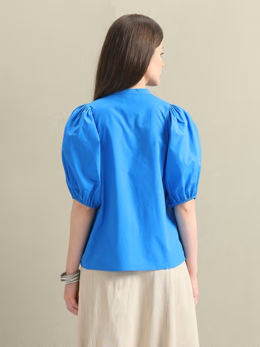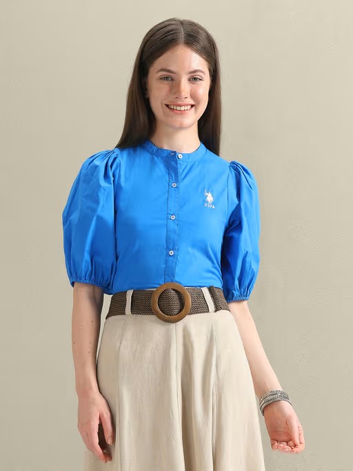 The Free Spirit collection channels the enchanting Blue City of Jodhpur, featuring captivating shades of blue, red, and white and a seamless fusion of ornamental designs with Americana graphics, fusing diverse influences while honouring the brand's identity. Exuding contemporary style with elbow-length puffed sleeves and a full button placket, this top from the Free Spirit collection offers both comfort and sophistication. Enhanced by its bright colour pattern and poplin fabric, it is finished with a curved hemline for a flattering silhouette.