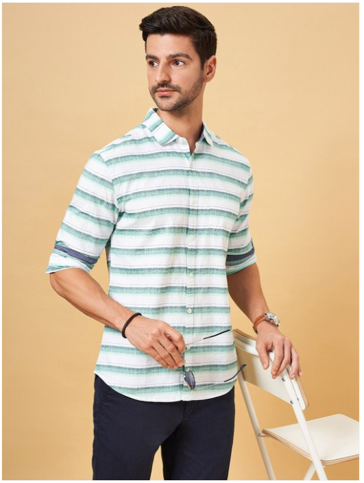Green horizontal stripes striped opaque Casual shirt ,has a spread collar, button placket, 1 pocket, long regular sleeves, curved hem