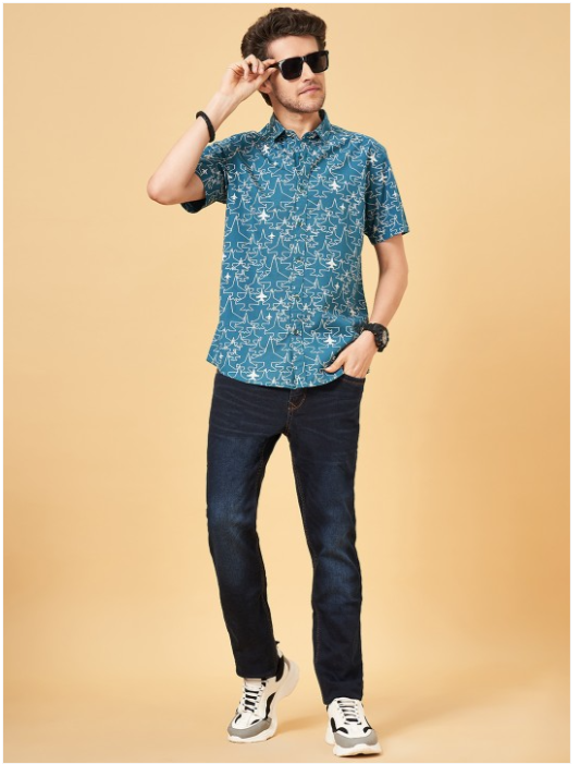 Blue & beige conversational printed opaque casual shirt ,has a spread collar, button placket, short regular sleeves, curved hem