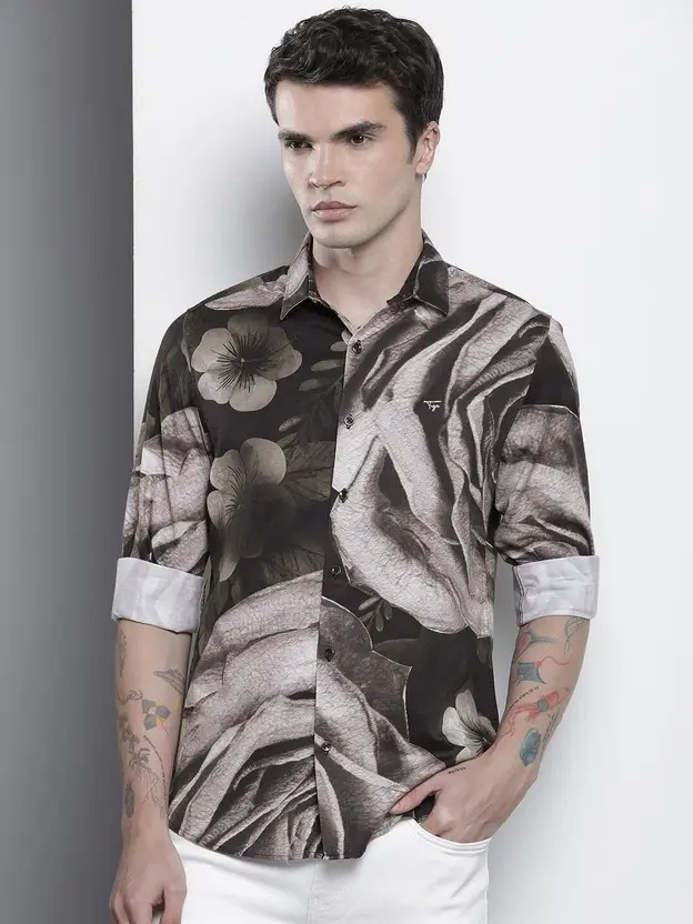 Men Slim Fit Floral Print Spread Collar Casual Shirt