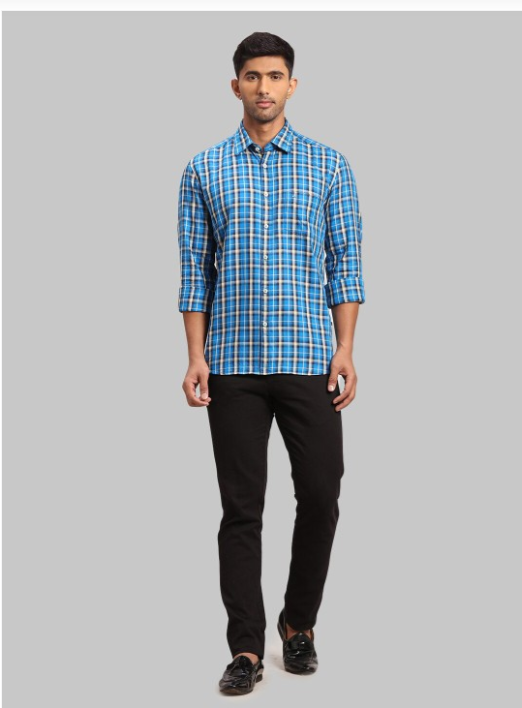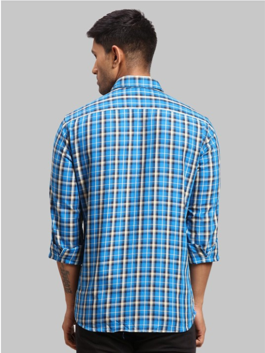 Blue and cream checked opaque casual shirt,has a spread collar, button placket,1 patch pocket.long regular sleeves,curved hem