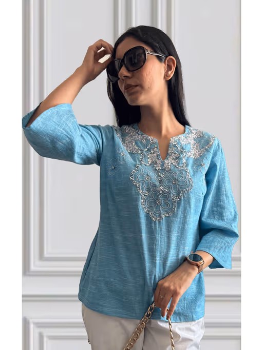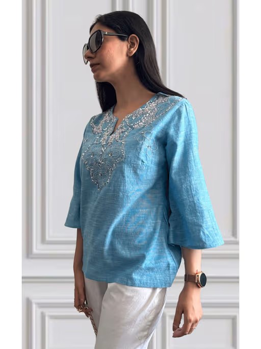 Blue Cotton Slub Embroidered Tunic