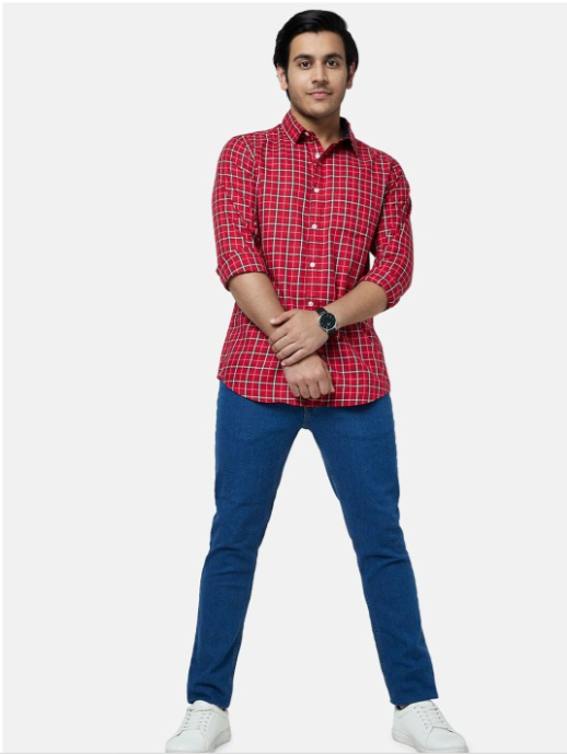 Turquoise blue checked opaque casual shirt ,has a spread collar, button placket, long regular sleeves, curved hem