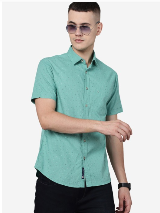 Green micro ditsy printed opaque Casual shirt ,has a spread collar, button placket, 1 pocket, short regular sleeves, curved hem