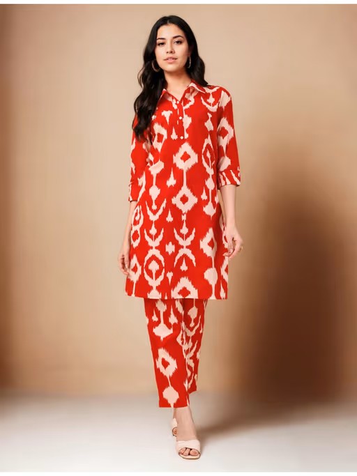 Cotton Ikat Printed Red Kurta & Pant Co-Ord (Set of 2)