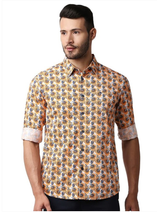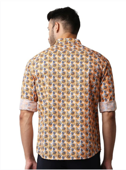 Orange floral printed opaque Casual shirt ,has a spread collar, button placket, 1 pocket, long regular sleeves, curved hem
