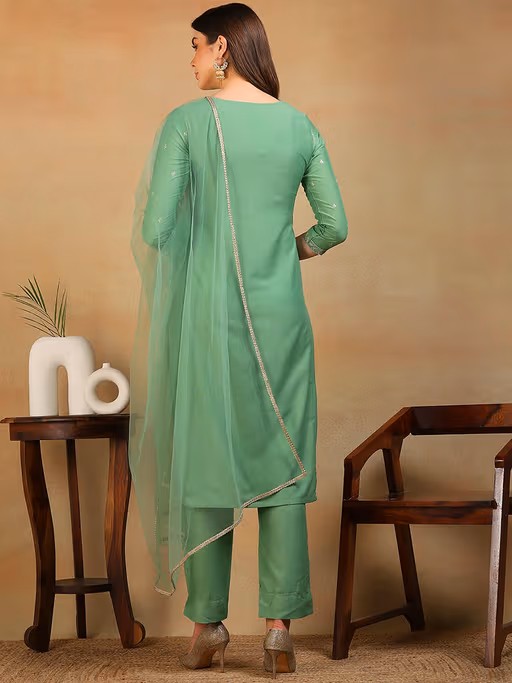 Women Green Silk Blend Embroidered Straight Kurta Pants with Dupatta (Set of 3)