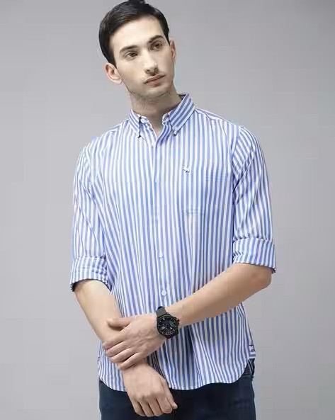 Men Striped Slim Fit Shirt with Button-Down Collar