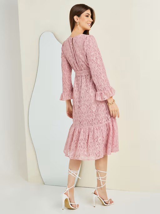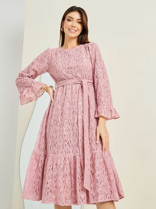 Mauve Lace Detail Tie Up Front Midi Dress With Belt (Set of 2)