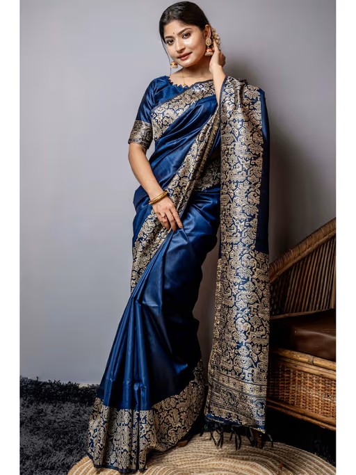 Dark Blue Womens Kanjivaram Soft Silk Saree with Unstitched Blouse