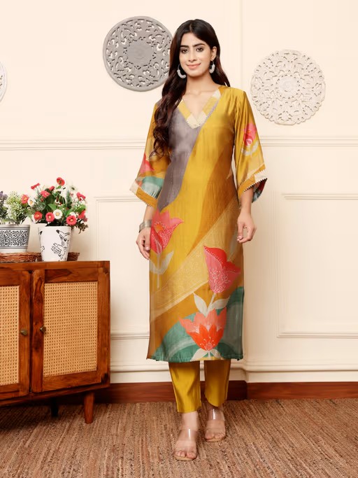 Content - 1 Kurta, 1 Pant Kurta: Fit-Straight Fit Color - Olive and Pink , Print and Pattern- Abstract Printed, Neckline - V Neck with Gotta Sleeves -3/4Th Bell Sleeves Length:- Calf Length Pant : Length - Ankle Length Pattern- Solid Fit , - Straight Waist- Elasticated Fabric - Silk Chanderi Olive Digital Floral Printed Style Trendy V Neck with Slit Kurta Set ,Crafted with Premium Chanderi Fabric, Fabric That Feels Like Feather To Your Body with Timeless Gota Detail , Which Give It A Very Royal and Premium Look Makes You Ready for Every Occasion and Day Wear Festivals.