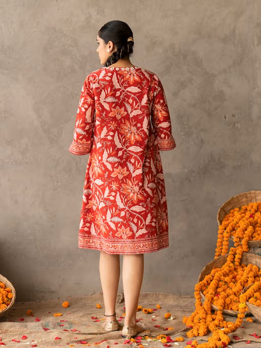 Celebrate the timeless elegance and charm with our blue block-printed short flared dress, adorned with exquisite hand-embroidered details on the neck. Meticulously crafted from 100% cotton, this dress offers a grace along with a comfortable experienceProduct Features- 100% Cotton block printed dress- Short A line fit dress- 3/4th Sleeves with cuff detail- Round neck with embroidery details - Side Pockets Size GuideModel height is 5feet 8 inches and is wearing size Small