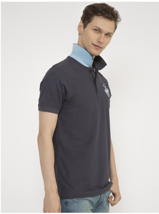 Black solid T-shirt, has a polo collar, and short sleeves
