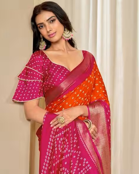 Women's Dola Silk Bandhani Print Zari border Saree with Blouse Piece