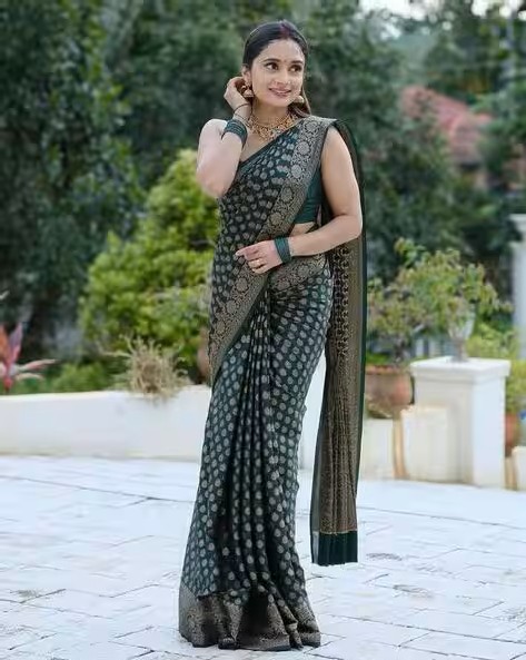 The last image gives a detailed look of the blouse piece that comes with this saree (The model is wearing a blouse from our in-house wardrobe)