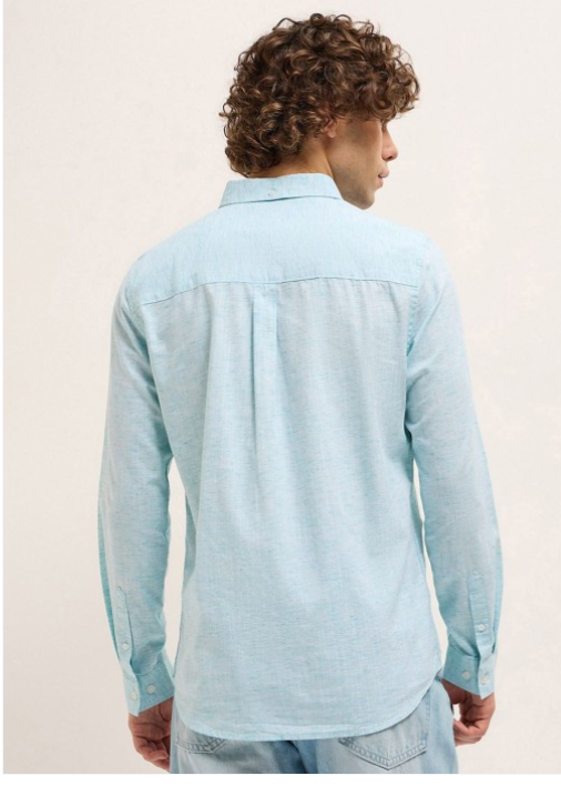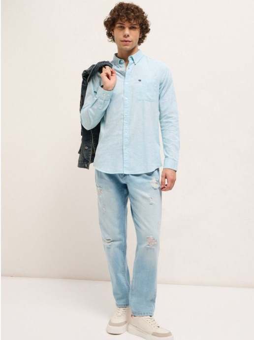 Blue solid opaque Casual shirt ,has a button-down collar, button placket, 1 patch pocket, long regular sleeves, curved hem