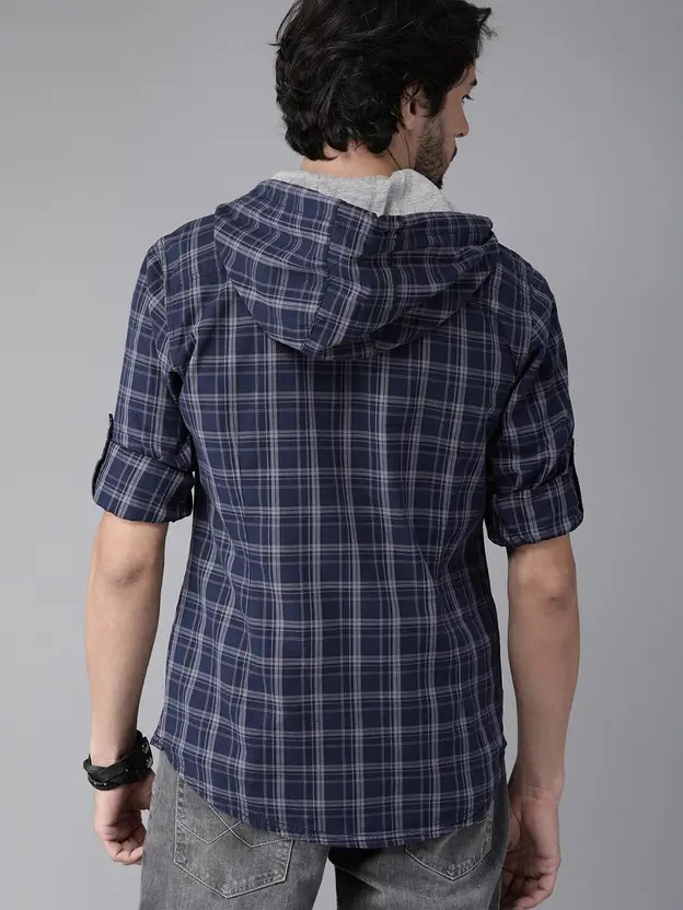 Men Regular Fit Checkered Hood Collar Casual Shirt